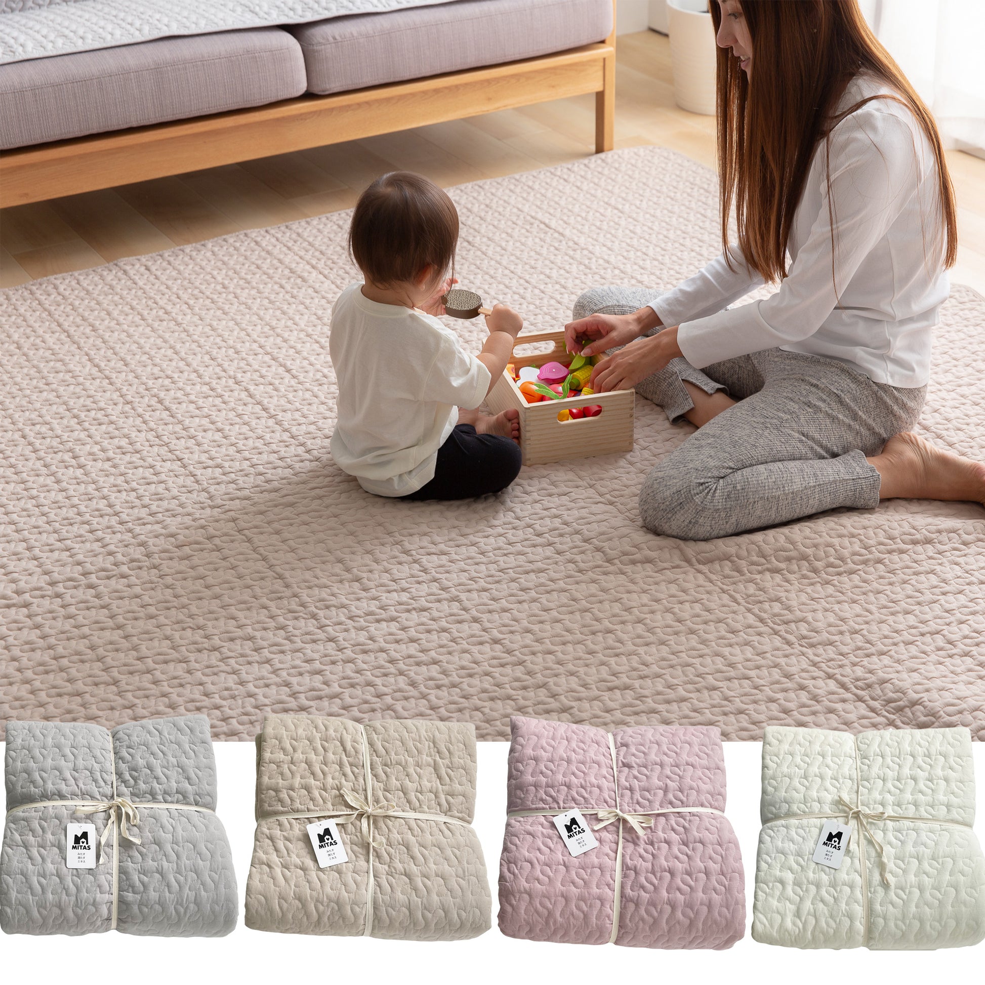 ふわもこでこぼこ生地が気持ちいいイブルのマット。表面の生地は綿素材なのでガサガサせずお子さまにも安心。プレイマットなどにも使っていただくことを想定してお手ごろな価格設定とさせていただいております。ナチュラルなインテリアにまとめたい方にもおすすめです。