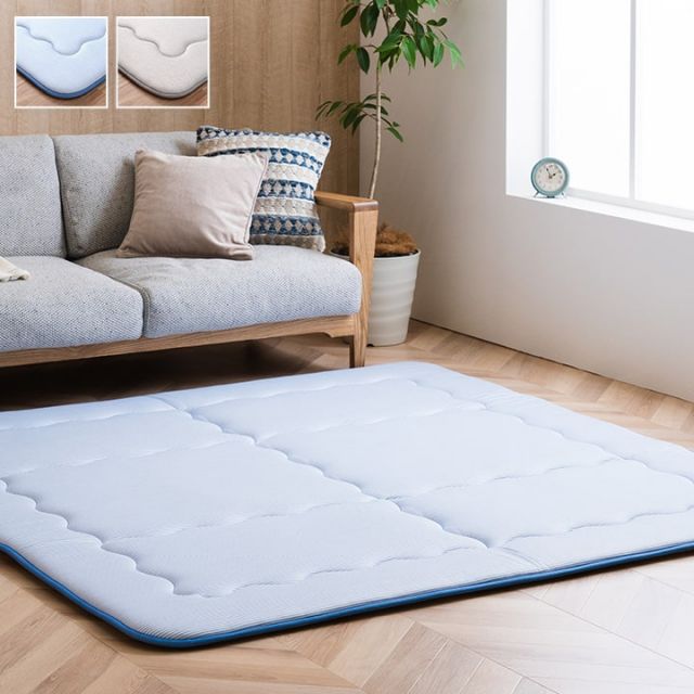 "底つき感のない厚さ約40mmのふっくらひんやり冷感ラグ。固綿を工夫したことで、へたりにくく、弾力性のある仕上がりになりました。触れた瞬間ひんやりと冷たく、夏を快適に過ごす涼感アイテム。今までの冷感ラグと比較しても圧倒的なボリュームで足音も軽減してくれます。寝転んでもゆったりできる大きめのサイズもあります。※掲載写真は表記サイズと異なる場合がございます。