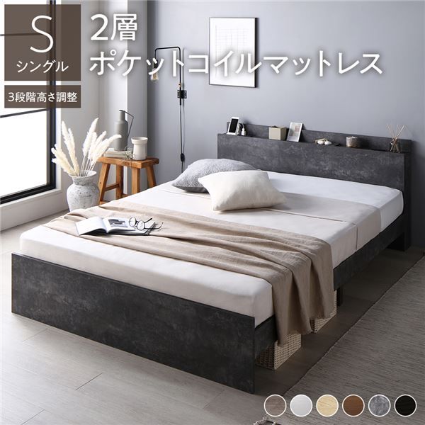 ベッド シングル 2層ポケットコイルマットレス付 ストーングレー 3段階 高さ調整可 コンセント 宮付 宮棚付 棚付 すのこ 頑丈 丈夫 ベッドフレーム ローベッド すのこベッド フロアベッド シングルベッド ベット 寝具 インテリア家具 ベッドルーム 寝室
