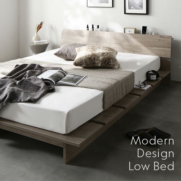 ステージベッド 棚付 ステージタイプ ダブル 国産ポケットコイルマットレス付 レギュラー グレージュ フレーム幅160cm マットレス幅140cm 宮付 コンセント 専用パッド 頑丈 通気性 ローベッド すのこベッド ベッドフレーム フロアベッド 寝具 ベッドルーム 寝室
